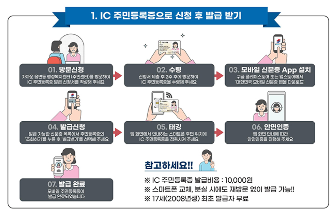 1) IC 주민등록증 신청: 가까운 주민센터를 방문하여 IC 주민등록증을 신청합니다.