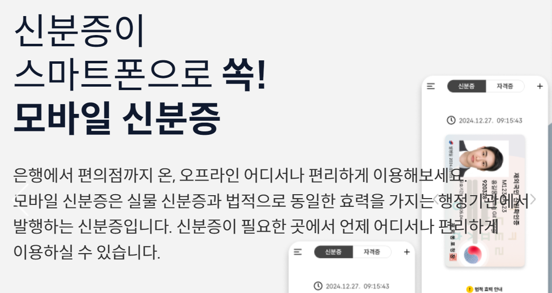 모바일 주민등록증은 스마트폰에 저장되는 디지털 주민등록증으로, 기존의 플라스틱 주민등록증과 동일한 신분 확인 기능을 제공합니다.