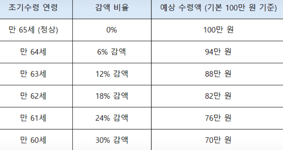 조기수령을 선택하면 연금액이 감액됩니다. 수급 연령보다 1년 앞당길 때마다 연금액이 6%씩 감액되며, 최대 5년 조기수령 시 총 30%가 감액됩니다.