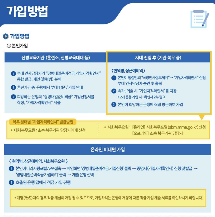 - 신병교육기관 교육 중: 협약은행에서 부대 방문 후 가입 절차 진행