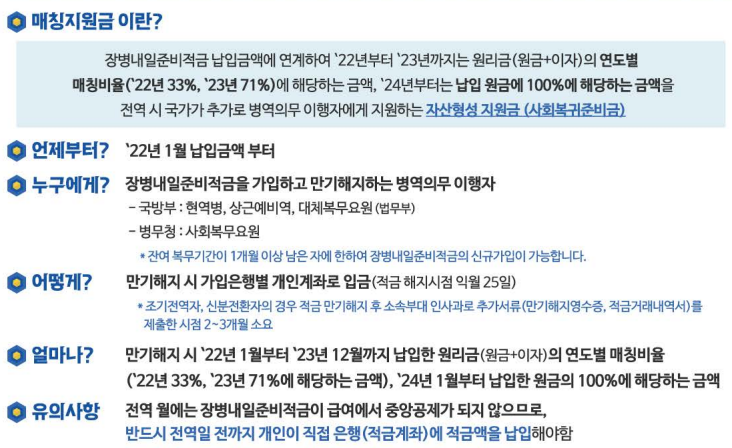 즉, 병역 기간 동안 스스로 모은 적금만큼을 정부가 추가로 지급한다는 의미입니다.