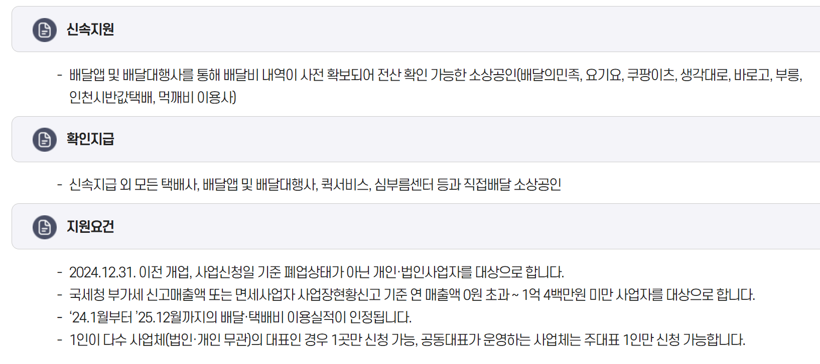 중소벤처기업부는 2025년 한시적으로 소상공인 배달 택배비 지원사업을 시행하고 있습니다.