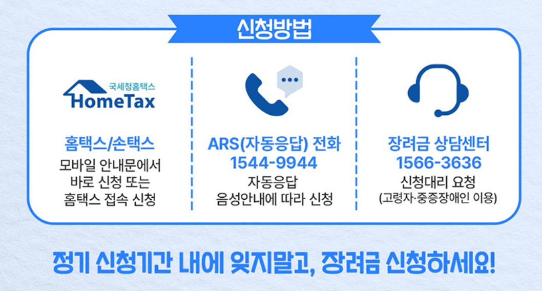 - 고령자나 중증장애인의 경우, 국세청 장려금 상담센터(1566-3636)에 연락하면 대리 신청을 요청할 수 있습니다.