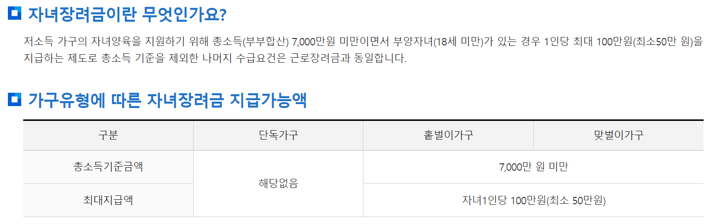 자녀장려금은 만 18세 미만(2006년 1월 2일 이후 출생)의 자녀가 있는 가구 중 소득과 재산 요건을 충족하는 경우 신청할 수 있습니다.