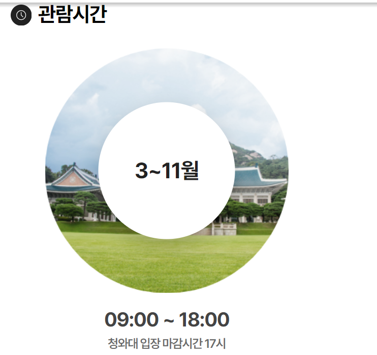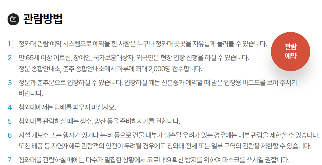청와대 관람은 1일 6회차(오전 9시~오후 4시까지 1시간 간격)로 운영됩니다.