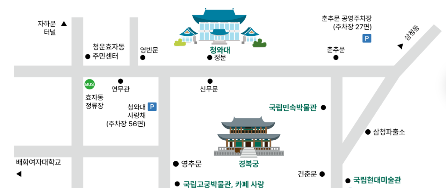 청와대에는 일반 관람객용 주차장이 별도로 마련되어 있지 않으므로, 대중교통 이용을 권장합니다.