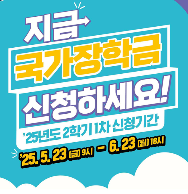 2025학년도 2학기 1차 국가장학금 신청 기간은 5월 23일(금) 오전 9시부터 6월 23일(월) 오후 6시까지입니다.