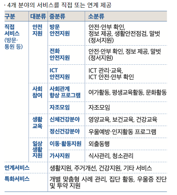 - 정기적인 방문 또는 전화, ICT기기를 활용한 안부 확인, 응급상황 대응 등