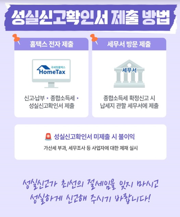 - 검토 결과를 바탕으로 ‘성실신고확인서’를 작성하고, 종합소득세 확정신고와 함께 제출합니다.