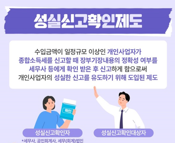 성실신고확인제도는 일정 규모 이상의 개인사업자가 종합소득세를 신고할 때, 세무사나 회계사 등 세무 전문가로부터 장부기장 내용과 소득금액 계산의 정확성을 확인받은 후 신고하도록 한 제도입니다.