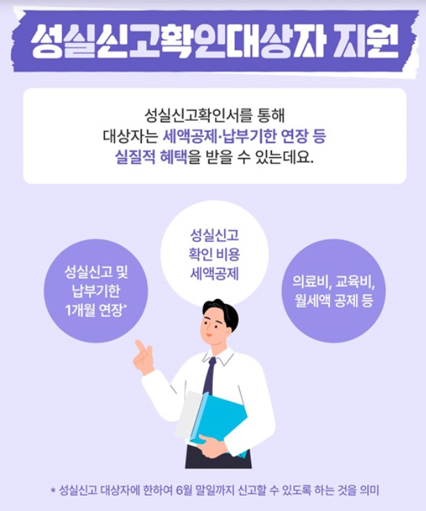 - 예: 2024년 귀속 종합소득세 ~> 2025년 6월 30일까지 성실신고확인서 제출