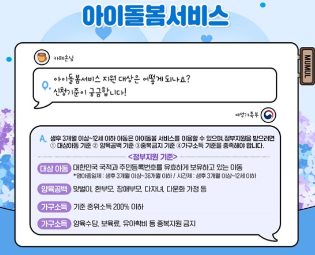 오늘은 아이돌봄서비스의 지원대상부터 홈페이지 신청방법까지 알아보겠습니다.