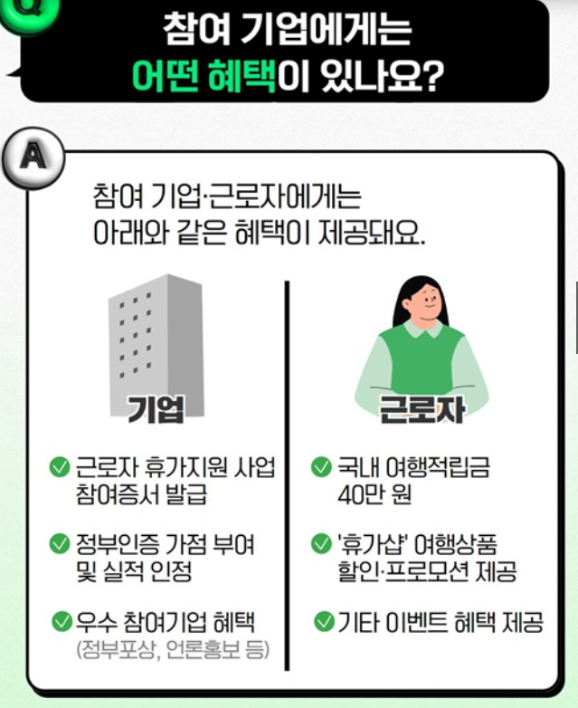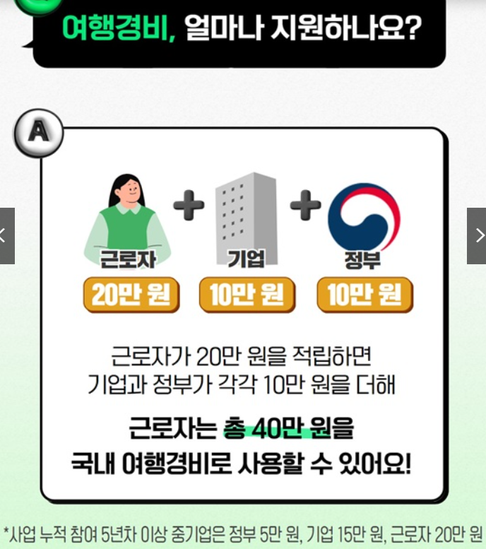 근로자가 일부 비용을 부담하면 정부와 기업이 함께 지원금을 추가로 적립해주어, 총 40만 원 상당의 휴가비를 마련할 수 있습니다.