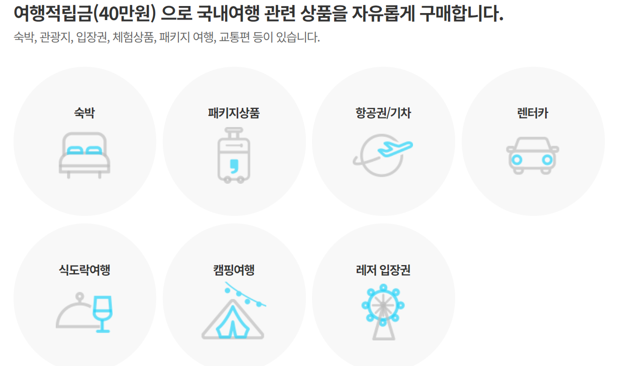 숙박, 교통, 여행상품, 관광지 입장권, 체험 프로그램 등 다양한 상품을 자유롭게 선택할 수 있으며, 사용 기한 내에 모두 사용해야 합니다.