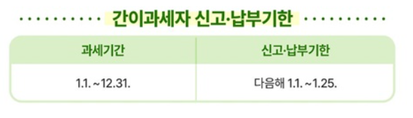 간이과세자는 연 1회만 신고(확정신고)하면 되며, 다음 해 1월 25일까지 신고·납부해야 합니다.