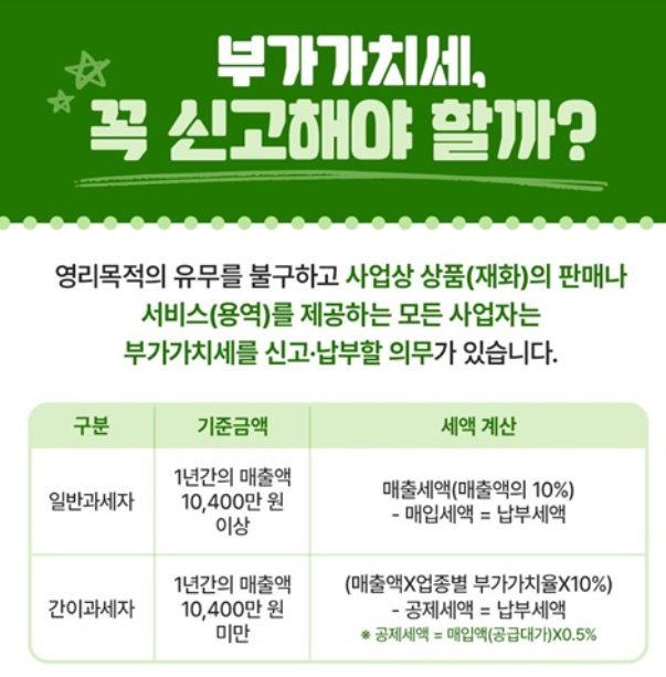 다만 연 매출액에 따라 일반과세자와 간이과세자로 나뉩니다.