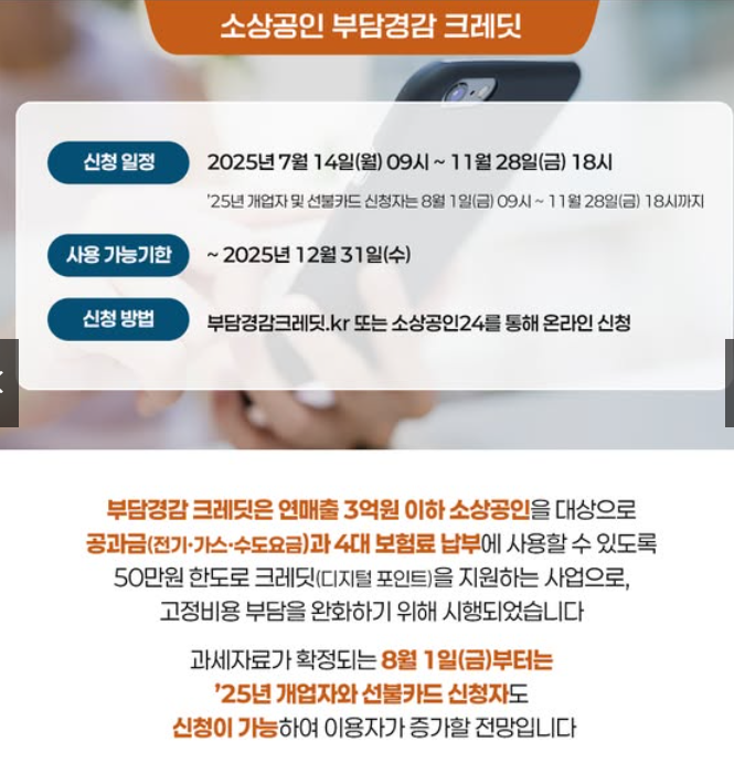 정부가 마련한 이번 부담경감 크레딧 사업은 공과금과 4대 보엄료처럼 고정비 부담이 큰 비용을 줄일 수 있는 실질적인 지원책입니다.