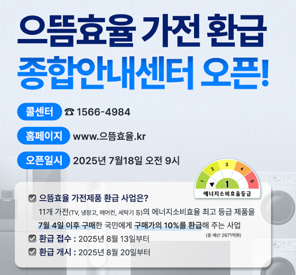 2025년 7월 4일부터 재원 소진 시까지, TV·냉장고·에어컨·세탁기 등 11가지 생활 밀접형 가전제품 중 에너지 소비효율 1등급 제품을 구매한 국민에게 구매 금액의 10%를 현금으로 환급해 줍니다.
